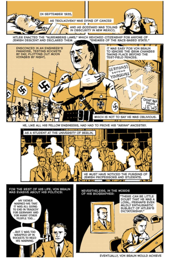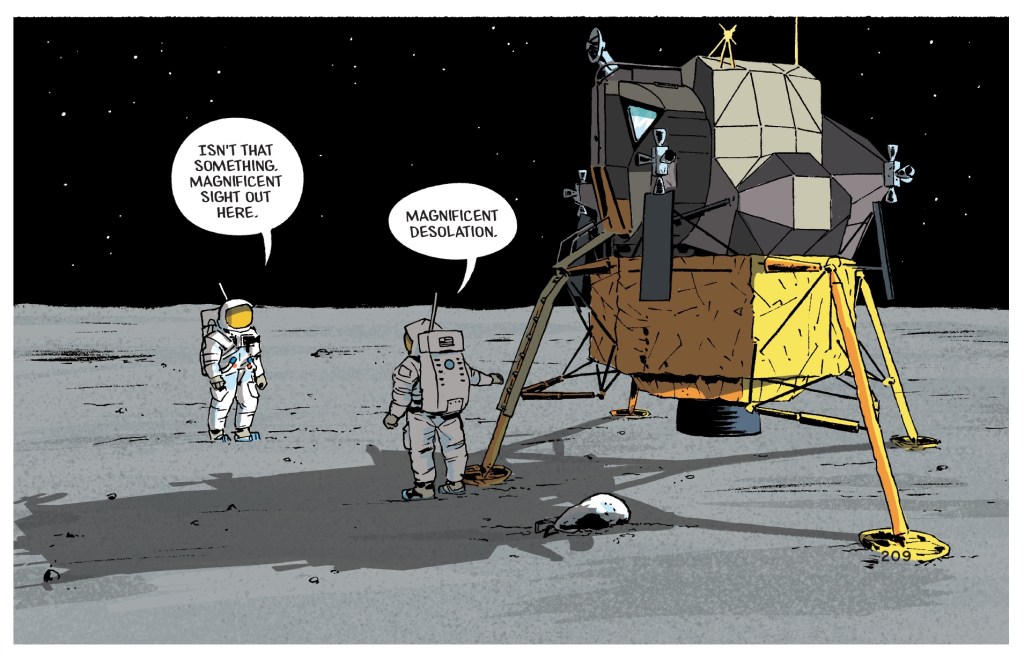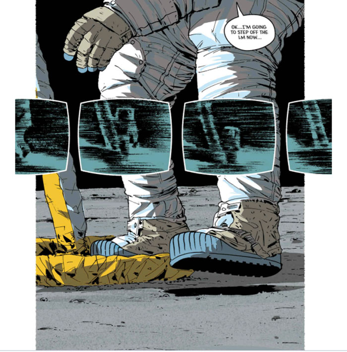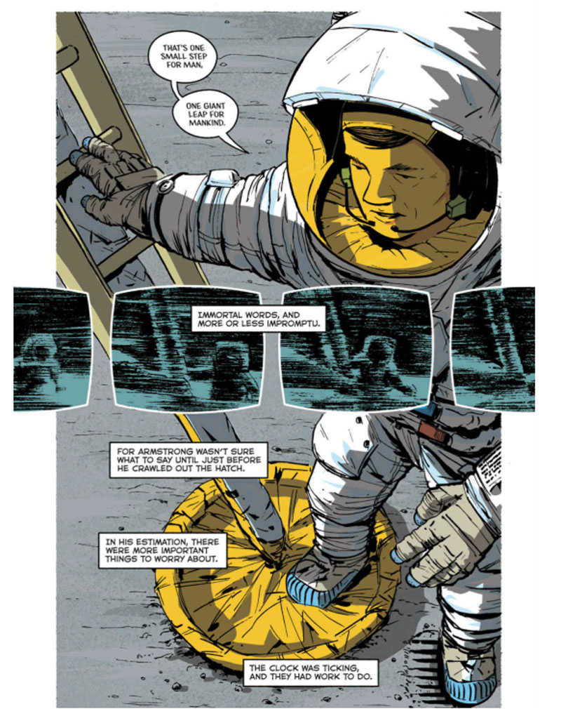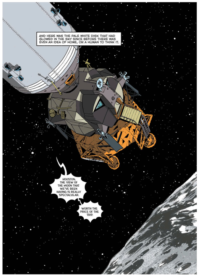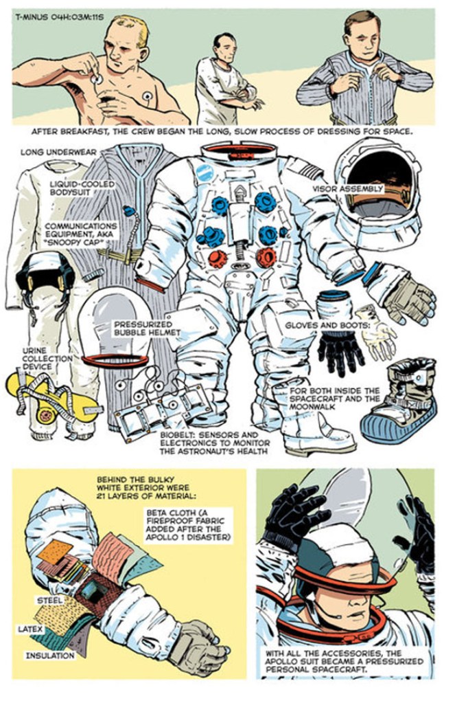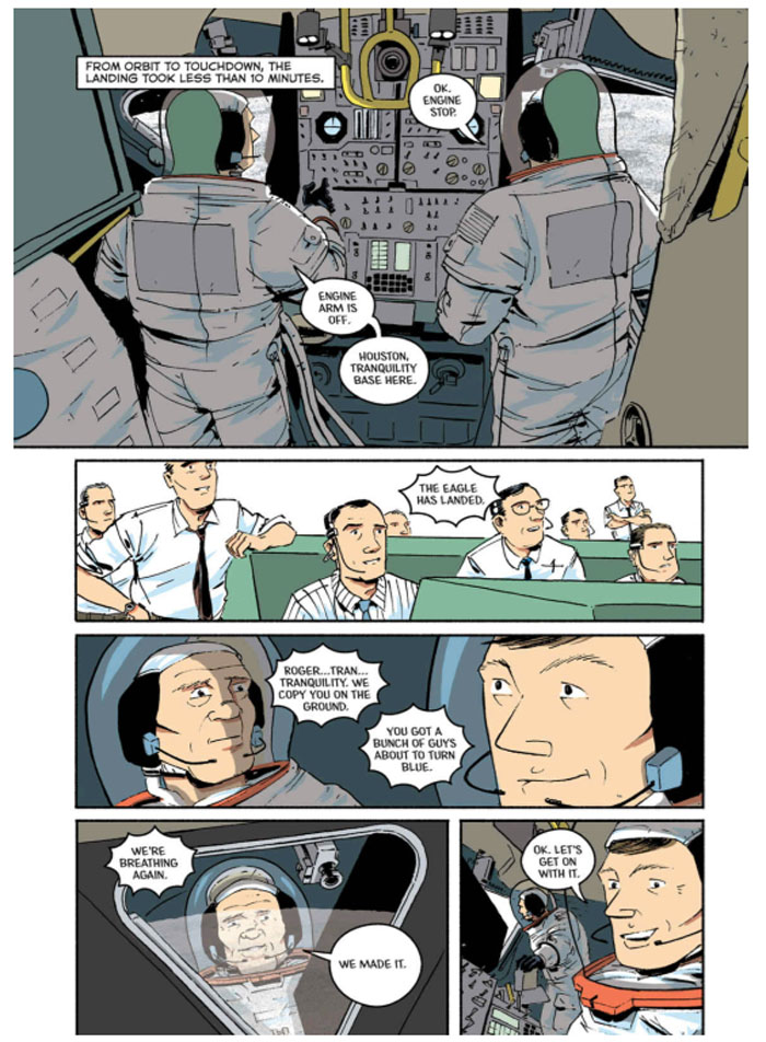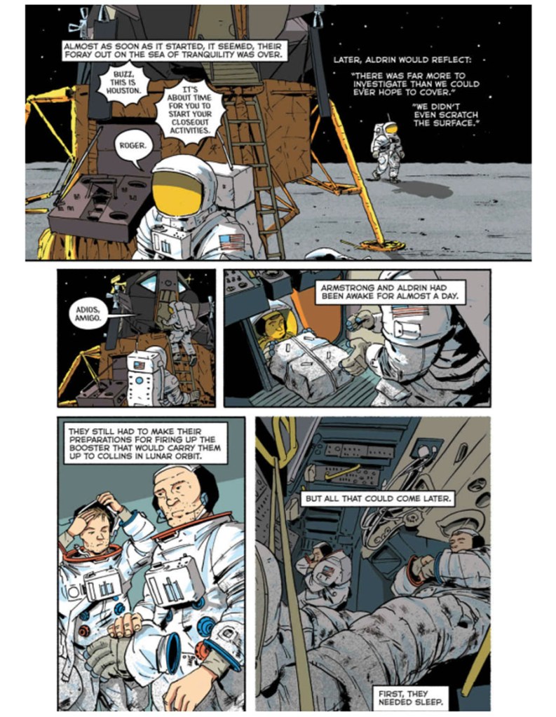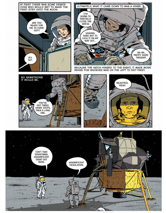 Grafik tarih yazarken, düzyazı tarih yazarken kaçınabileceğiniz bir yön var; örneğin, astronotları ay modülünde gösterirken, anlatı için önemli olmadıkça her düğmeyi ve anahtarı ayrıntılı olarak göstermek düzyazı tarihçisinin sorumluluğu değildir. Ama astronotların birbirleriyle konuştuğu bu önemsiz panellerin hepsinde bile, oksijen bağlantılarını gösterme veya kolçakların bu noktada aşağıda mı yukarıda mı olduğunu anlama ihtiyacı duyuyorum. Kaskları takılı mı çıkarılmış mı? Bu tür araştırmalar en çok zamanımı aldı ve bitmiş kitapta ne kadarının görünür olduğundan emin değilim. Ama kendi adıma, her şeyin doğru yerinde olduğundan emin olmanın yolunu bulmak istedim.