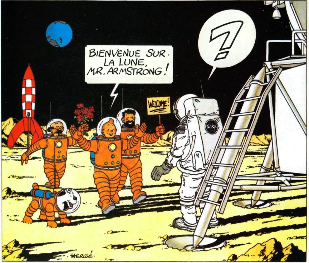 Ünlü sanatçı Herge’in konumuzla ilgili yaptığı çizim de ilginçtir. Fransız haftalık dergisi Paris-Match, Hergé’den Apollo 12 görevini kutlayan bir çizgi roman yaratmasını istemiş, o da bunu yapmıştır. Yukarıda Armstrong’un da yer aldığı bu resim görülüyor.