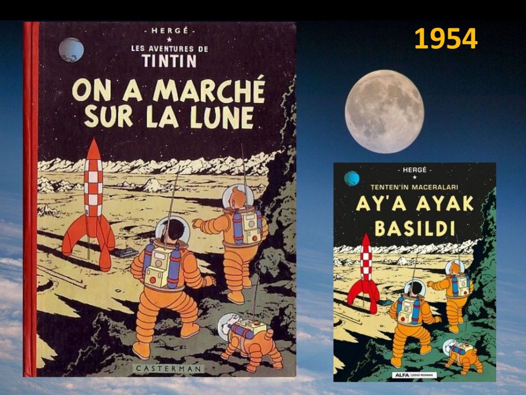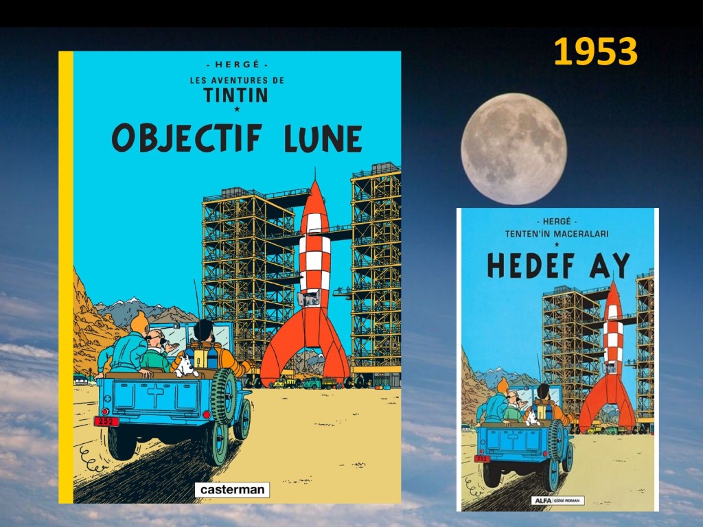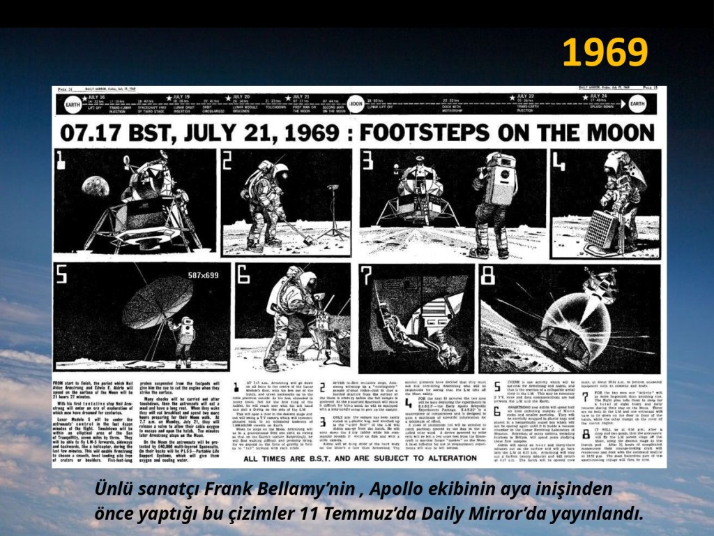 1930’lardan başlayarak 2025 yılına kadar farklı örnekleri gözden geçirelim. Görüleceği gibi, bu örnekler içinde Frank Bellamy’nin çizimleri, Apollo 11’in ekibinin aya inişi öncesi olmasına rağmen, iyi araştırmalara dayanan, oldukça gerçekçi çizimlerdir.