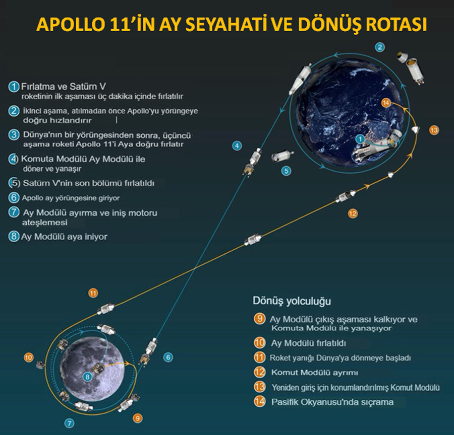 Apollo 11’in Ay’a gidiş ve dönüşü konusunda BBC tarafından yayınlanan rotası görülüyor.
