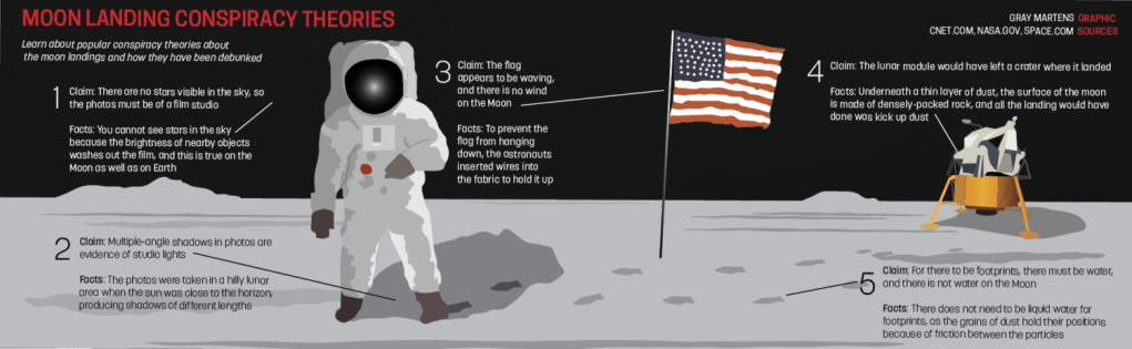 1969’dan beri Ay’a inişle ilgili birçok farklı teori ortaya atıldı. Bazıları uzaydaki radyasyonun astronotları öldüreceğini savunurken, diğerleri rüzgar olmamasına rağmen şüpheli bir şekilde dalgalanan Amerikan bayrağına dikkat çekti. ( Bu konuda, nette dolaşan fotoğraflarla ve videolarla, aslında herşeyin ustalıkla hazırlanan stüdyo çekimi olduğuna dikkat çeken sürüyle mesajlar hatırlanacaktır ! ) Bu arada, 1970’lerden sonra Ay’a yapılan görevlerin neden uzun süre durduğu sorgulamaya başlandı .