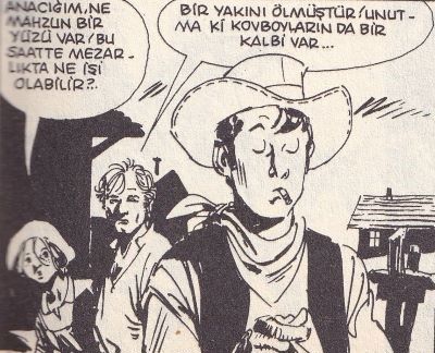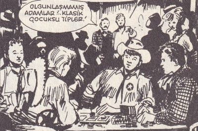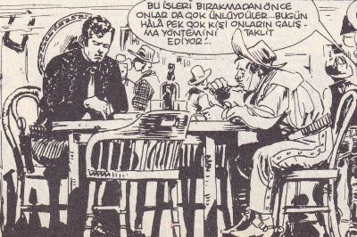 Öykümüz; Ken’in ‘Hero’s Rest Saloon’a girişi ile başka bir havaya dönüşür. ‘Western Yıldızları Geçidi’. Burada enteresan olan yazar ve çizerimizin de kendini olaya sokup, kendi vinyetlerini çizip, kendileriyle de dalga geçmeleri. Bu durumda bize düşen ise araştırıp, taraştırıp kim kimmiş, mevzusu neymiş bulmak. Buyurunuz…