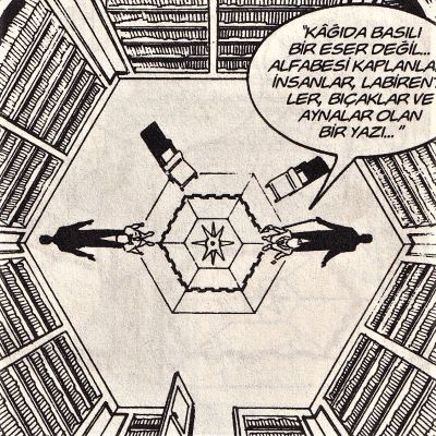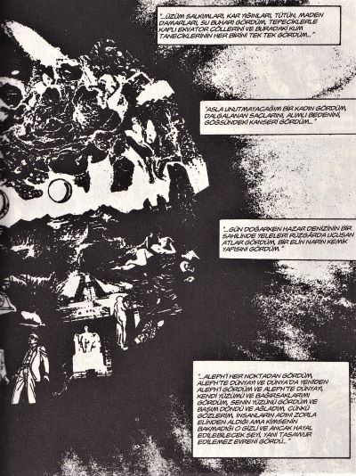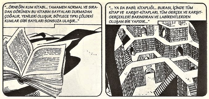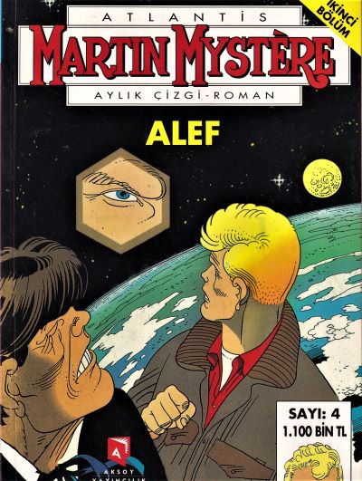 Doğrusu hiç şaşırmadım, Martin Mystére’in Aksoy Yayıncılık’tan çıkan 4. sayısının kapağında “Alef” başlığını görünce. Evet, “Alef”… Evet, evet Borges’in şu ünlü “Alef” öyküsü. Martin Mystére gibi bir kitap kurdunun Borges gibi bir yazarı bilmemesi mümkün değildi tabii. Macera, Martin’in arkadaşı İspanyol Edebiyatı uzmanı Prof. Temesvar’ın Borges üzerine yayınlanan bir makalesiyle başlar. Prof. Temesvar, Borges’in öykülerindeki birçok kişi ve nesnenin “uydurma” olmasına rağmen, bazı şeylerin, hem de gizemli şeylerin doğru olduğunu iddia etmektedir bu makalesinde. Martin, Java ve Prof.Temesvar, Kara Adamlar’ın bir saldırısını atlattıktan sonra, doğruca bir zamanlar Borges’in müdürlüğünü yaptığı Buenos Aires Ulusal Kitaplığı’na giderler. Maceranın ikinci bölümü tümüyle bu ünlü kitaplıkta geçer. Üçlümüz, Borges’in “Kum Kitabı”nda sözünü ettiği “Her Şeyin Kitabı”nı aramaktadır. Prof.Temesvar, bu kitabın var olduğunu ve bulunabileceği tek yerin de bu kitaplık olduğunu söyler.