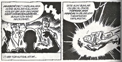 ÇizgiRoman olur da içinde sinema olmaz mı? Kum Kitabı öyküsü (Lal KM 39. cilt 101. sayfa/Aksoy 3. cilt Kum Kitabı 5. sayfa), karanlık tiplerin Kolombiya Üniversite’si, Latin Amerika Edebiyatı Defterleri dergisi, yazı işleri toplantında ki herkesi öldürmesi ile başlar. Hayır herkesi değil. Prof. Temesvar hariç. Çünkü dışarıda yağmur vardır. Temesvar, ıslanmamak için arka koridorlardan gider ve tesadüfen kurtulur. Aynı, efsanevi, Akbabanın Üç Günü filminde olduğu gibi. öyküde de, filmde olduğu gibi ifadesiz bakışlı adamlar heyecan bile duymadan işlerini yaparlar. Akbabanın Üç Günü 1975 ABD yapımı politik bir gerilim filmi (Three Days of the Condor). Fimin yönetmeni Sydney Pollack‘tır. Robert Redford ve Faye Dunaway başrolünü oynamıştır. Ustalara saygı duruşu.