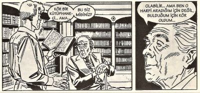 Martin burada okuduğu kitabı bırakarak Borges’e döner ve aralarında şu diyalog gelişir: “Kör bir kütüphaneci… ama… Bu siz misiniz?” Borges yanıtlar: “Olabilir… Ama ben o harfi aradığım için değil, bulduğum için kör oldum.”