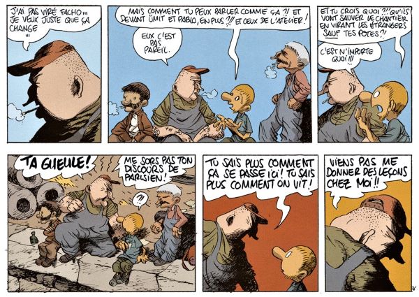 Albümün ilk bölümlerinde belli belirsiz kendini gösteren politik tutum, Marco’nun ilk gençliğinde çalıştığı, babasının emekli olduğu tersanenin kapatılacak olmasıyla birlikte belirginleşiyor. Marco, bir sergi için işçilerin portrelerini fotoğraflamaya başlıyor. Geçmişini inkar ettiği için iş gibi baktığı bu fotoğraflar giderek hayatının merkezine oturuyor ve babasından yadigar gibi gördüğü yaşlı işçilerle vakit geçirir oluyor. Albüm, 2002 Seçimleriyle, Sarkozy’nin başkan oluşuyla bittiği için siyasi bir yüzleşme de yaşanıyor. Marco’nun nevrotikliği gibi Paris’le taşra, sağla sol, sahicilikle pozculuk, mahalleyle büyük siyaset, göçmenlerle Fransızlar, Müslümanlarla Hıristiyanlar, Fransa’yla Cezayir de diyaloglarda karşı karşıya geliyorlar. Larcenet, o bölümlerde birbirleriyle çelişen pek çok görüşü farklı karakterlerin ağzından aktarıyor. Kah mırıldanarak, kah bağırarak, kahrederek…