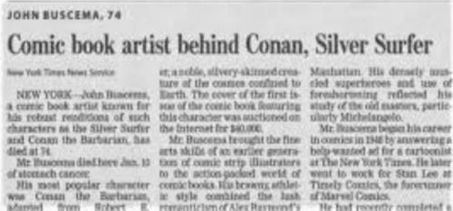 Bu satırlar, Eric Nash imzalı olarak 28 Ocak 2002 tarihinde New York Times’ta yayınlandı. Gazete , 74 yaşında aramızdan ayrılan John Buscema’nın ölüm haberini veriyordu.