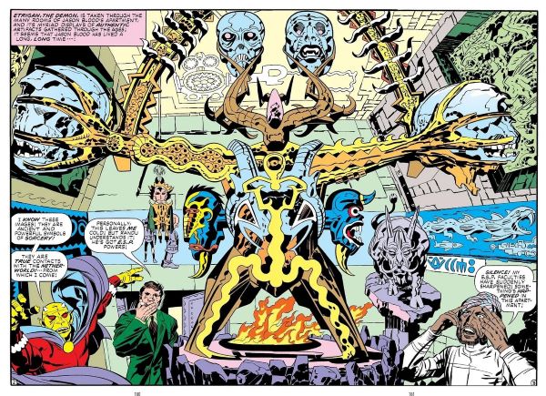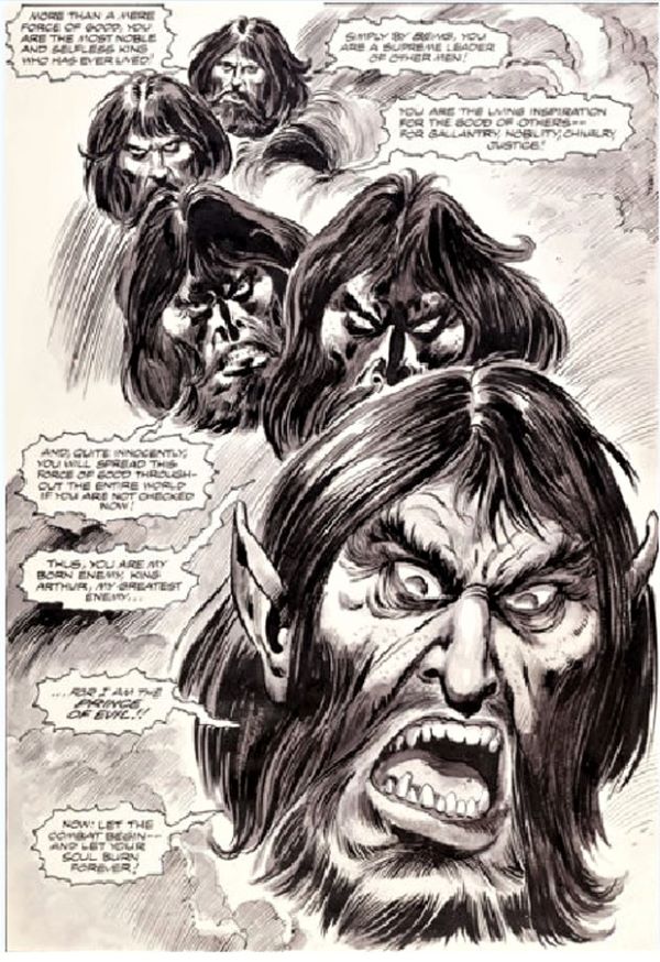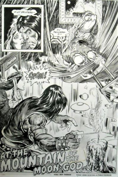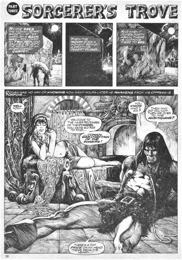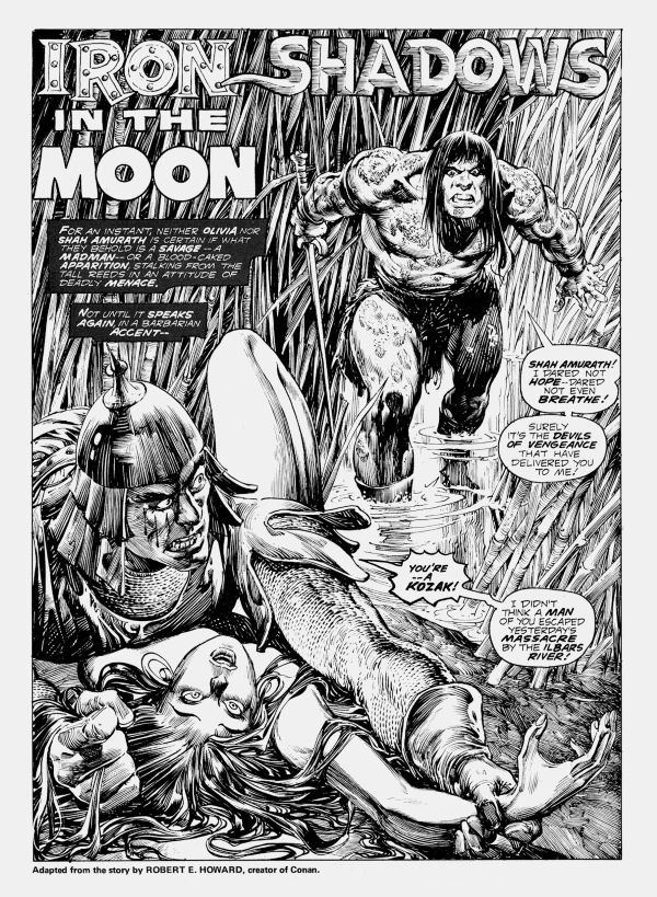 ‘’ Alcala’nın Black Colossus macerasını muhteşem mürekkeplemesiyle 35 sayfalık bir uyarlamaya başladılar. Açılış sayfası, Buscema’nın sağlam çizimleri üstünde ayrıntılı mürekkep işçiliğinin muhteşem bir parçasıydı. Bana göre, “Iron Shadows in the Moon” uyarlamasıyla gerçekten hız kazandılar. Üçüncü sayfa, nefret ettiği bir düşmandan intikam almak üzere olan çılgın bakışlı bir Conan’ı gösteren tam sayfa bir çizim. Bu beni John Buscema’nın Conan’ının daha önce hiç benzerinin olmadığını düşündüğüm bir başka yönüne getiriyor ve Buscema’nın Kimmeryalı’nın vahşiliğini gösterme yeteneğini ortaya koyuyor. ‘’