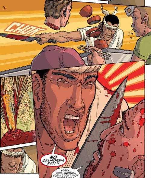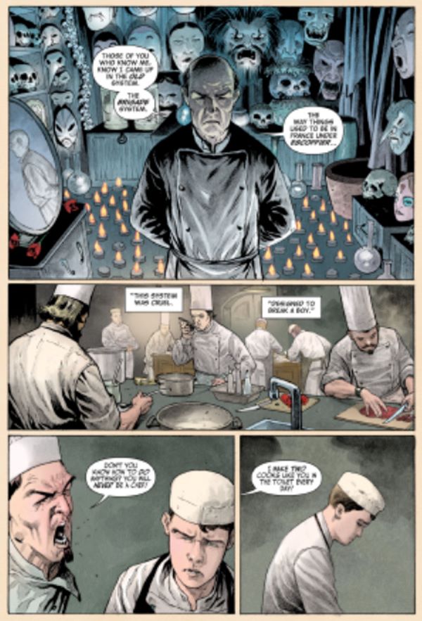 Çizgi romanda, Bourdain ve Rose’un oyuna bakış açısı oldukça etkili. Samurayları yiyecek ve açlık hakkında karanlık ve iğrenç hikayeler anlatan şeflerle değiştiriyorlar ve her hikaye Japon mitolojisinde bulunan birçok dehşetten ilham alıyor.