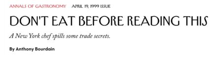 Makalenin adı ‘’ Bunu okumadan yemek yemeyin ‘’dir. Bourdain’in daha sonraki yayınlarının habercisi olan makale, onun dünya çapında duyulmasını sağlar, üstün kariyerinin başlangıcı olur. Uzun makalede şunlar yazılıdır.