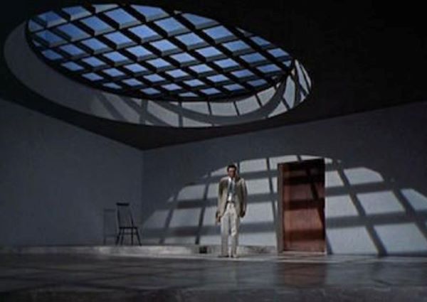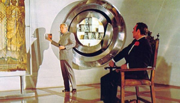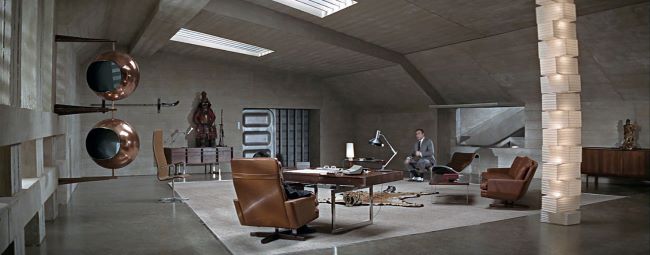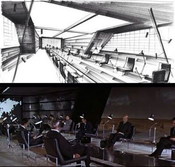 Ken Adam 1950’lerin tarihi dramalarının fırfırları ve dantellerinin ötesine, Soğuk Savaş’ın modern füzeleri, iç mekanları, otomobilleri, yatak odaları, ofis duvarları ve kötü adamlarıyla bakmak üzereydi. ‘’
