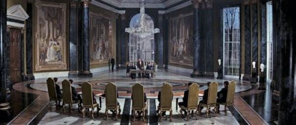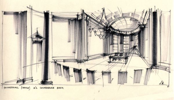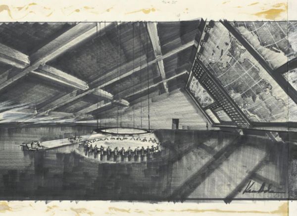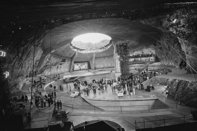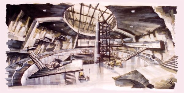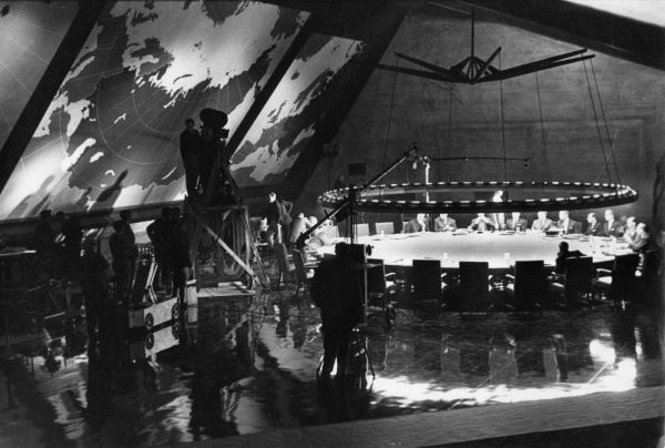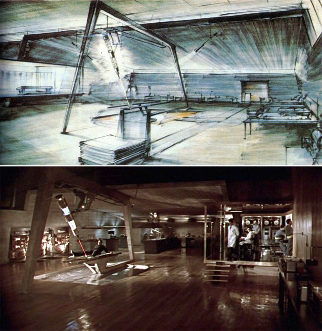 Filmin Pinewood film stüdyosundaki seti ve Ken Adam’ın çizim çalışmalarından çeşitli örnekler görülüyor.