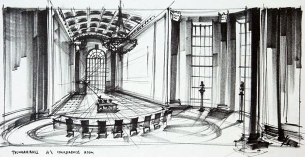 Yeraltı inleri, spot ışıklı yuvarlak masalarda toplanan savaş konseyleri, altın külçeleriyle dolu banka kasaları, nükleer denizaltı üsleri, dağ laboratuvarları, ileri teknoloji uzay istasyonları, göz alıcı Las Vegas çatı katları, salonlar, yanardağların içine gizlenmiş füze rampaları, … Saymakla bitmeyecek tasarımlar, hep onun hayal gücünün uzantıları.