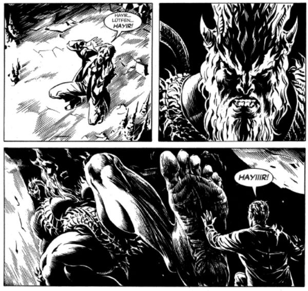 –Cehennemin Kapısı macerasına gelince, zaten Dampyr destanının içinde var olan bir kavram Cehennem. Dampyr’in en büyük -ve aslında biraz da mecburen gizliden gizliye- müttefiki Sevimli iblis Nikolaus ve Şövalye Savnok Dampyr evreninin Cehennem saflarındandır. Bilindik cehennem kavramı Dante’nin “İlahi Komedya”sındaki gibi olmasa da zaten var olan bir kavram olarak karşımıza çıkıyor Dampyr sayfalarında. Aslında “diğer tarafta” da süregelen bir denge mücadelesi bulunmakta, aktörleri bazen sırf kendi keyiflerince ilginç senaryolar oluşturarak sorun yaratabilmektedirler. Ancak geçerli olan ve hem Gece Efendilerinin, hem Cehennem tayfasının hem de aydınlık tarafın ya da ışığın tarafının uyması gereken ve uyulmadığında başlarına dert açabilen tek güç kendi aralarındaki Denge Yasası’dır. Aslında “yakalanma da ne yaparsan yap” aforizmasıyla açıklanabilecek bir yasadır da denebilir.