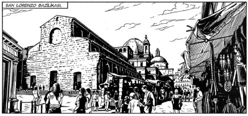 Floransa şehrinin tasviri konusunda, web aracılığıyla belgeler oluşturmaya başladım . Daha sonra fotoğrafları çekmek ve ilgili yerleri bizzat deneyimlemek için oraya gittim. Referans metnini göz önüne alarak ve senaryonun isteklerinden yararlanarak, aldatıcı bir şekilde bir şehir görüntüsü vermek için ilk sayfalarda gerçek, güneşli bir Floransa göstermeye karar verdim. Dante’nin Cehennemi’nin kapsamlı bir tasviri göstermek istenseydi, iki özel sayı yeterli olmazdı !