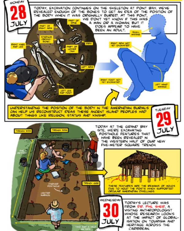 ‘’ Arkeoloji çizgi romanlarını sahada yapmanın en belirgin özelliklerinden biri, bunları ofiste veya stüdyoda yapmaktan çok farklı olmasıdır.Kaçınılmaz olarak, garip çalışma yerleri, belirli araçların eksikliği, farklı hava ve çevre vb. ile yetinmek zorundasınız. Küçük tropikal adalardaki arkeolojik alanlar hakkında çizgi roman yapmak egzotik ve çok eğlenceli olabilir, ancak sıcak, yapış yapış ve kirli olabilir – kalem ve kağıtla çalışmak için ideal koşullar değildir. Yıllar içinde tekniğimi ve yaklaşımımı, sahada çalışma şeklimin evde çalışma şeklime olabildiğince benzer olması için uyarladım, ancak nem, sivrisinekler ve tropikal fırtınalar gibi bazı şeyler üzerinde hiçbir kontrolünüz yoktur. Kontrol edemediğim bir diğer şey de zaman. ‘’