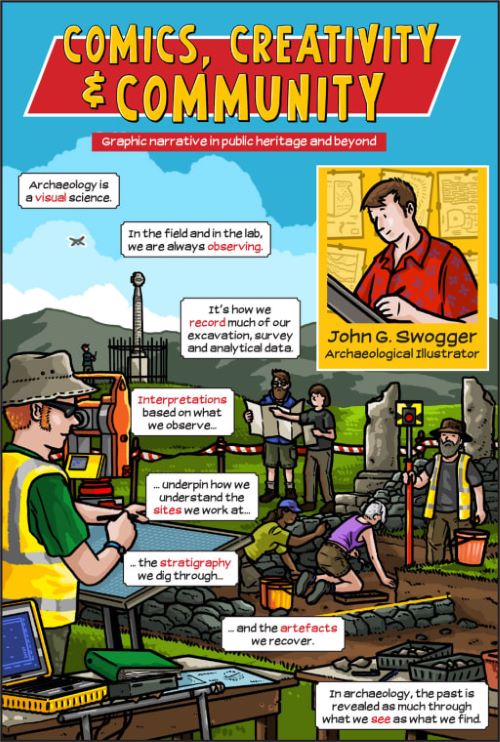 ‘’ Swogger’ın çalışmaları, arkeolojik metodolojileri öğretmek için çizgi roman ortamının süreç odaklı kullanımını vurgular; örneğin, alan dokümantasyonu ve karmaşık alan tarihlerini temsil etme yolları gibi. Çatalhöyük Araştırma Projesi’ndeki gibi eğitim çizgi romanları, devam eden arkeolojik kazıları metin ve illüstrasyonla birlikte iletmenin etkin örneğidir. ‘’