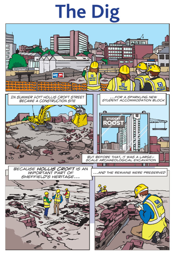 ‘’ Hollis Croft, Sheffield’ın endüstriyel merkezinde yer almaktadır ve on dokuzuncu yüzyılda endüstriyel çelik fabrikalarının, meyhanelerin ve evlerin bitişiğinde yer alıyordu. Burada yapılan arkeoloji çalışmaları işçi sınıfının yaşamlarına dair bir bakış sunabilir. Bu eserin oluşturulmasında kullanılan çeşitli medyalar ( kitap, çevrimiçi kitap, site arşivi ) göz önüne alındığında, öncelikle kitabın sunuluş biçimine odaklanacağım ve ardından içerik incelemesine geçeceğim.