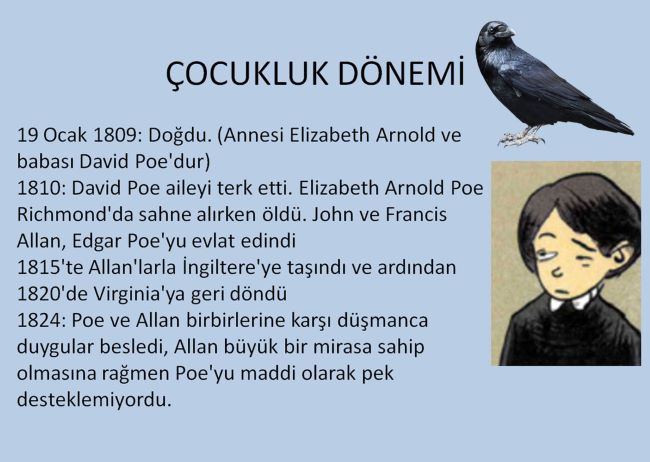 Bir çocuk düşünelim, okulu mezarlığa bakan, okuduğu okulunun müdürü matematik derslerini mezarlıkta ölüler arasında veren biri olsun. Çocuklar çıkarma işlemi için , mezar taşlarından okudukları ölülerin ölüm tarihlerinden doğum tarihlerini çıkararak çalışsınlar, ölen cemaat üyeleri için mezar kazmaya yardım etmiş olsunlar. Edgar Allan Poe’nun çocukluğu, İngiltere’de tam da böyle bir ortamda geçmişti.