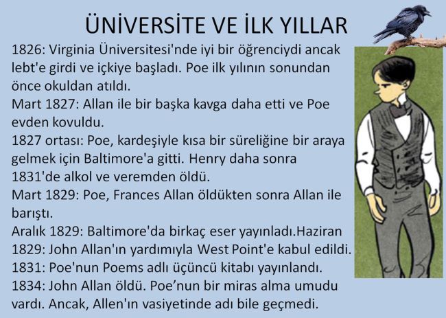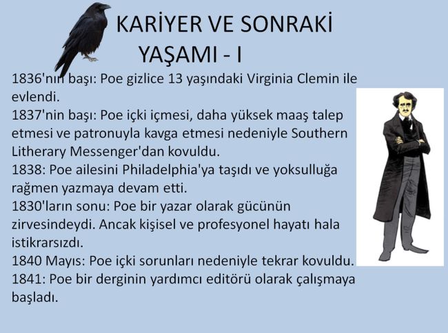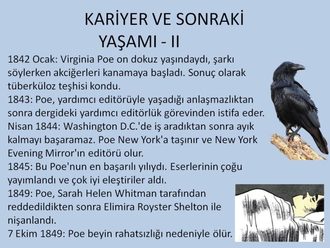Ayrıca, Poe’nun sevilen ‘’ Kuzgun ‘’ şiirinin Ülkü Tamer tarafından yapılan çevirisi için şu link kullanılabilir.