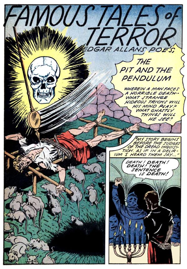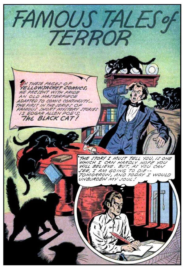‘’ Poe’nun çizimlerle uyarlanmış ilk öyküsü 1943’te, resimli şiirlerden oluşuyordu. 1944’te birkaç uyarlama geldi. Poe’nun “Morg Sokağı Cinayetleri’’ ilk uyarlamaydı. O zamandan beri, neredeyse her yıl, aralarında bir boşluk olacak şekilde uyarlamalar yapıldı. 1963’ten sonra yıllık uyarlamaların sayısı artmış ve 2007 itibariyle yaklaşık 300 uyarlama olduğu tahmin ediliyor. Royal’e göre Poe, “çizgi roman biçimine en çok uyarlanan Amerikalı yazar”dır. erken uyarlamalar, genellikle orijinal hikayenin katı yeniden anlatımlarıydı. Orijinal hikayelerin veya şiirlerin gerçek metinlerini içerir. Klasiklerdeki iki uyarlama, aslında “Annabel Lee” ve “The Bells”in tam metinleri ve resimleri vardı.