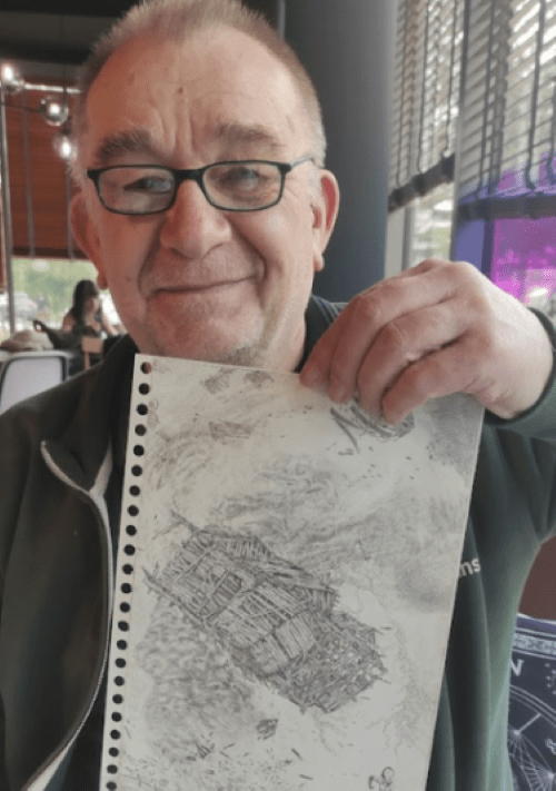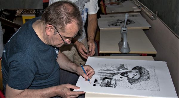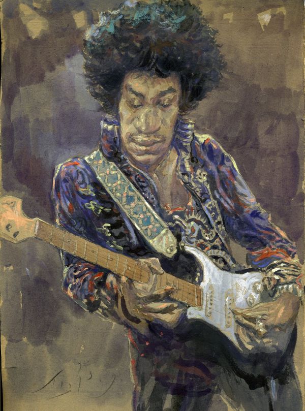 Yukarıda sanatçının Jim Hendrix ve Bob Dylan çizimleri görülüyor.