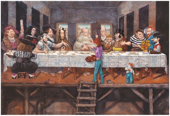 Ivana Smudja senaryoyu yazarken, metinler anekdotlarla dolu, kısa hikayelerle sanatçılara veya tablolara çok sayıda selam vermiş. Ancak, benim için esas şaşırtıcı olan, her sanatçının resim stilini Smudja’nın yeniden üretmesi oldu! Smudja resimleri, konu edindiği sanatçıyla aynı tarzda yapmış, ama kendi mizahi uslubunu yansıtmış.