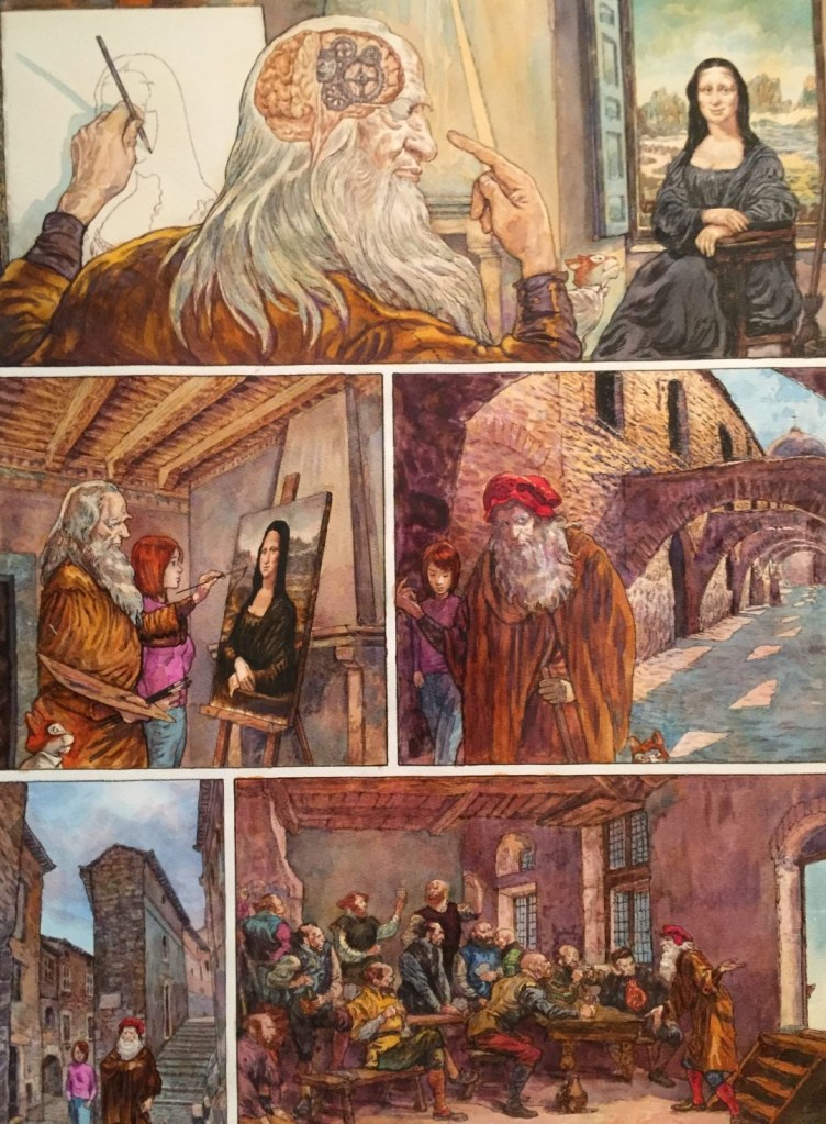 Kitaptaki her sanatçı bölümü , sanatçının kısa özgeçmişinin yer aldığı , yine Gradimir Smudja’nın çizimi görülen iki sayfayla başlıyor. Bu özgeçmiş bilgilerinin bulunduğu sayfalardaki sanatçı çizimleri , çeşitli karakteristik özellikleri yansıtması nedeniyle, tıpkı çizgi roman bölümleri kadar ilgi çekiyor. ( Özellikle Picasso’yu bir ‘’ matador ‘’ olarak gösteren resim , iyi bir örnek ) Tüm çizgi roman bölümleri adeta , hem araştırma hem de çizim açısından üzerinde çok uğraşılmış paneller geçidi . Okur , Lascaoux mağara resimlerinde , Michelangelo’nun başyapıtı diyebileceğimiz Sistine Şapeli’nde ya da örneğin bir Delacroix tablosunda hep aynı titizlikte hazırlanmış renk cümbüşüyle karşılaşıyor. Üstelik bu tablolar canlanmış durumda. Yani, çok iyi bildiğimiz tablo görüntüleri, sanki bir animasyon filmi izlercesine, çeşitli diyaloglarla zenginleştirilmiş olarak birer birer , kronolojik sırayla karşımıza çıkıyorlar ve de kırmızı iplikle bizleri izlediğimiz konudan bir başka konu ( sanatçı ) dünyasına çekiyorlar.