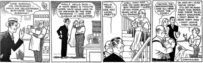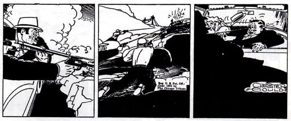 4 Ekim 1931’de Chester Gould‘un Dick Tracy‘si yukarıda görüldüğü şekilde, Detroit Mirror’ın sayfalarında ilk kez sahneye çıktı. Chester Gould, Chicago’nun manşetlerinden alınmış ve dönemin sert gangster filmleriyle desteklenen yeni ‘’ sert gerçekçilik ‘’ stiliyle çizgi roman görünümünü önemli ölçüde değiştirmişti. Gould’un, kalın çizgiler ve yontulmuş yüzler ile karmaşık olay örgülerini kullanması, huzursuz ortamda bulunan okuyucuları kısa sürede memnun etmişti.