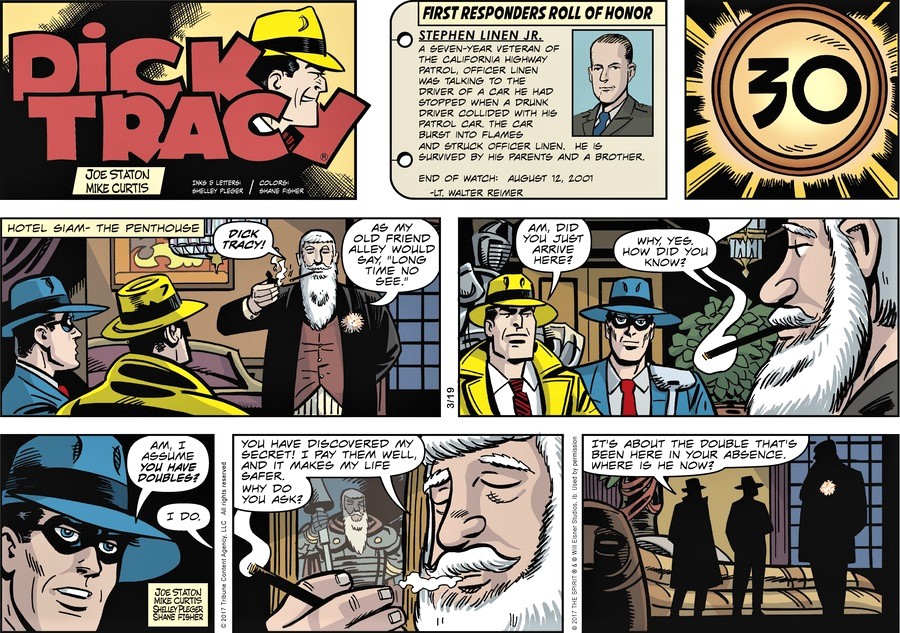 Staton : Temel olarak, sadece kendi yorumumuzla klasik “Dick Tracy” çalışmalarını yapmak istedik. Mike’ın hikayeler için fikirleri vardı , ben de her zaman daha önceki yıllarımdan beri Tracy’yi yapmak istemiştim. “Tracy” ile ilgilenmek ve etkinlikler yapmanın bir nimet olması arasında, başka hiçbir projeye konsantre olamadım, bu yüzden bir devamlılık için yola çıkıyorum ve Shelley tüm şeridi yapacak – kalemler, mürekkepler ve harfler – ve sonra ben katılıyorum. Evet, Tracy şapka takıyor ve ofisten her çıktığında yağmurluğunu giyiyor. Bu onun süper kahraman kostümü. Görüntüleri geleneksel, ikonik ve tanınabilir tutmak istedik.