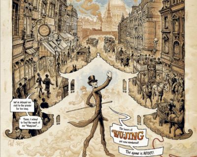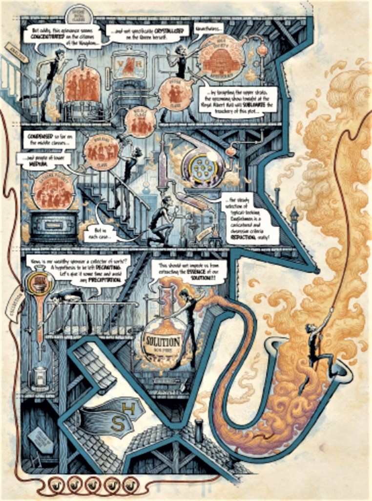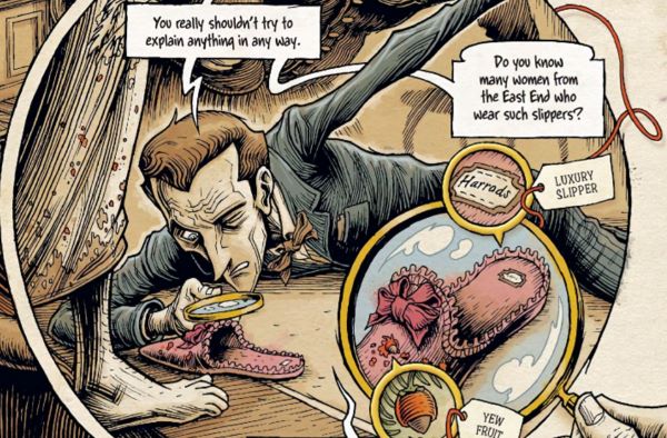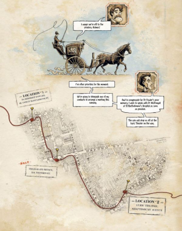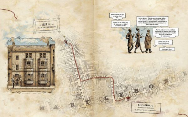 Dahan’ın tasarımı muhteşem – tüm sayfayı kullanıyor, çok yoğun veya kafa karıştırıcı olmadan panelleri dolduruyor, kahramanlarımızın davadaki ilerleyişini göstermek için bir Londra haritası kullanıyor ve hikayeyi Viktorya döneminin sonlarındaki Londra’ya dayandırmak için inanılmaz ayrıntılar kullanıyor. Sokak sahneleri muhteşem. Panellerde o kadar çok yardımcı ayrıntı var ki Holmes ve Watson’ın yürüdüğü sokaklarda hangi dükkanların olduğunu görmek eğlenceli. ”