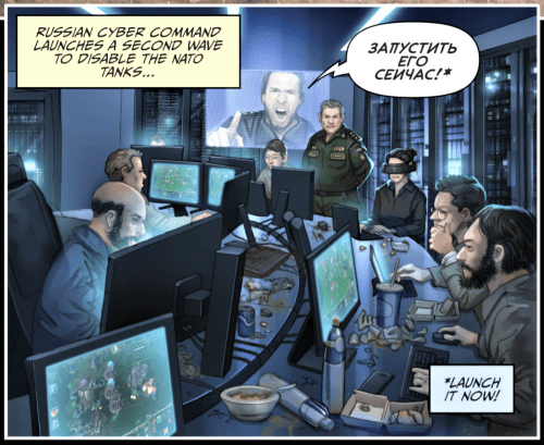 ‘’ West Point Akademisi Siber Enstitüsü (Amerika Birleşik Devletleri’ndeki ana askeri eğitim kurumu), yakın gelecekte , robotların, uçan dronların, yapay zekanın vb. kullanımıyla ilgili sorunlar ve riskler hakkında çizgi romanlar yayınladı . Çizgi romanlar ABD Ordusu’nun genç askerleri ve subaylarına yönelik ve geleceğin savaşları ile bu savaşlara hazırlık için, onların bugün neler yapılabilecekleri hakkında düşündürmek için tasarlanmıştır. Çizgi romanlardan biri Rusya ile savaşa adanmıştır. (…)Rus yer robotları (gerçek hayattaki Vulcan-9’a çok benzer), kör Amerikan savaş oluşumlarını yarıp geçiyor ve Amerikan tanklarına tanksavar füzeleriyle saldırıyor. Rus otonom tankları bozgunu tamamlıyor ve karelerden biri de piyadelerimizin savaş dış iskeletleriyle ilerlediğini gösteriyor.