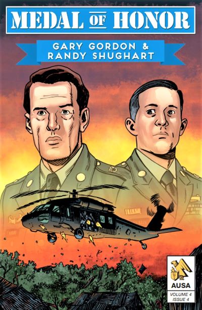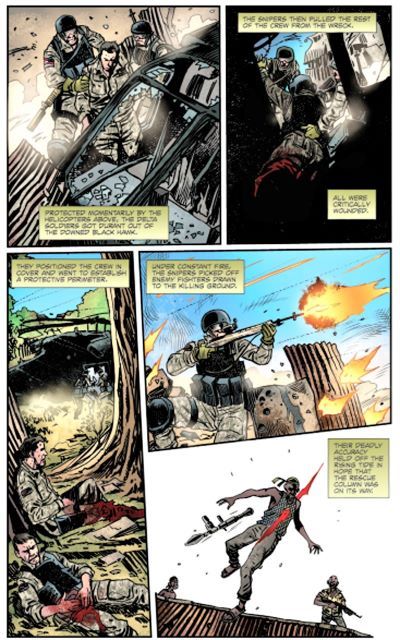 Aşağıdaki örnek çizgi romanda Gary Gordon ve Randy Shughart’ın savaş anına ait gerçek hayat hikayeleri anlatılıyor. Somali’nin Mogadişu kentinde Görev Gücü Korucusu ile birlikte özel harekât keskin nişancı ekibinin parçası olan ikili, “Kara Şahin Düştü” olarak ünlenen saldırı sırasında, pilotları ve mürettebatı korumak için helikopterin kaza alanına yerleştirilmeye gönüllü oldular. Hayatta kalma şanslarının zayıf olduğunu bilerek çatışmaya atladılar. Gordon ve Shughart sonuçta başkalarını kurtarmak için hayatlarını vermiş oldular.