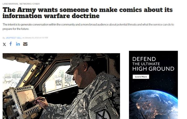 25 Ocak 2022 tarihinde , nette ilginç başlıklı bir haber yer aldı. ‘’ Ordu , bilgi savaşı doktrini hakkında çizgi roman yapılmasını istiyor. ‘’ Amaç ise şu şekilde açıklanıyordu ; ‘’ topluluk içinde geniş bir kitleye yönelik potansiyel tehditler ve hizmet konusunda geleceğe hazırlanmak için neler yapabileceği hakkında diyalog oluşturmak. ‘’ Washington kaynaklı haberde Ordu Siber Enstitüsünün, NATO’nun faaliyetlerini desteklemek için bilim kurgu prototiplemesini (SFP) (bilimkurgu hikayeleri, grafik romanlar/çizgi romanlar, filmler ve animasyonlar) fütüristik teknolojilerin sonuçlarını araştırmak için kullanmak istediğini yazıyordu.