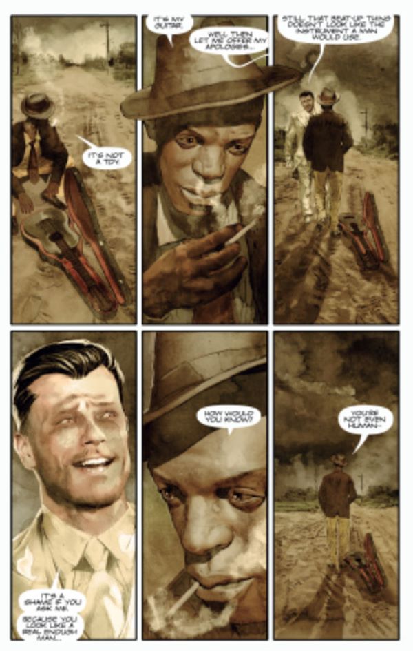 Charlie Adlard, ikonik tarzı ile ‘A Crossroads Repetition’ başlıklı öyküde , blues sanatçısı Robert Johnson’ın bir kavşakta şeytanla karşılaşması olayını çok güzel resmetmiş.