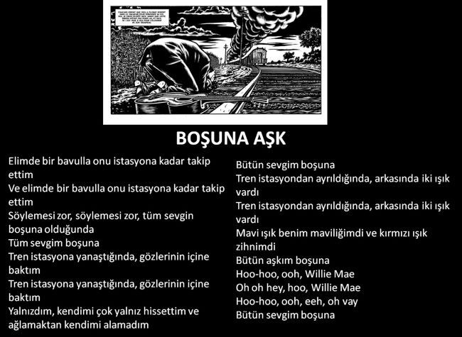 ‘’ Bir şarkıdan alıntılar dinler gibi, kitabın çizimini, ritmini keşfetmek için albüme göz atabilirsiniz. Bu tuhaf sayfalarda, tam sayfa çizimlerde, ufku genişleten, perspektifleri açan İtalyan formatında duruyoruz. 15. sayfada, geceye doğru ilerleyen bir trenin olduğu demiryolu rayları boyunca, dizlerinin üstüne çökmüş, arkasında gitarı olan bir adamla donup kalıyoruz. Her şeyden önce her sayfası başlı başına bir sanat eseri olan muhteşem bir grafik kitap. Siyah ve beyaz, tıpkı otuzlarda Mississippi’de beyaz erkeklerle siyah erkeklerin dünyasını ayıran demiryolu hattı gibi, ” beyaz bir kadının bakışlarının siyah bir adam için ölümcül olabileceği” bir sınır çizgisi. Siyah ve beyaz, blues notalarındaki notalar gibi. Siyah ve beyaz, iyi ve kötü gibi, Tanrı ve şeytan gibi.