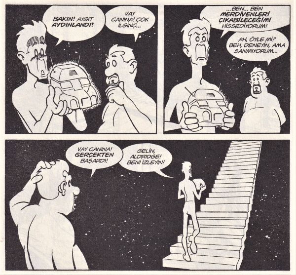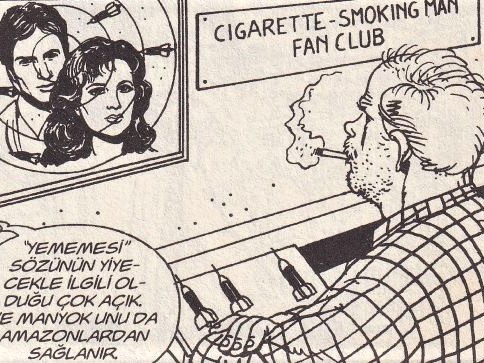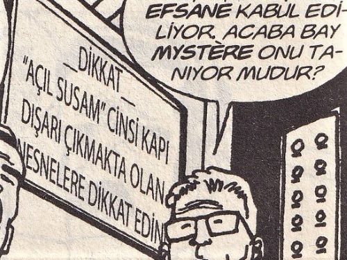 Martin Özel Seri’nin farklı ve mizahi bir yapısı olduğunu yukarıda belirtmiştik. Öyküdeki bir sürü mizahi unsurdan ilgimizi çeken iki tanesini yazalım. İlki; maceranın 4. sayfasında duvarda ki uyarı levhası. ‘Dikkat. Açıl Susam, cinsi kapı. Dışarı çıkmakta olan nesnelere dikkat edin’. Açıl susam açıl, diyerek açılan kapı 🙂 . Öbürü ise; Sayfa 97’de (231. sayfa), X-Files dizisinin 2 ajanı, dart tahtası üzerinde hedef olarak tasvir ediliyor. Yanındaki tabelada ise, Altrove’da, ‘Sigara içen erkekler fan kulübü’ olduğunu öğreniyoruz. 🙂 Ayrıca, adam da Allredo Castelli‘ye benziyor.
