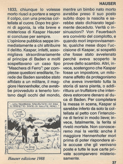 Lal Kitaptan 2021 yılında çıkan 201 no’lu, Martin Mystere-Kaspar Hauser Gibi isimli macerada (Orijinal 368. sayı/Nisan 2020) bu konu işlenmiş ve Kaspar Hauser‘in gizemine ait bir öykü hazırlanmıştır. Senaryosunu Mirke Perniola yazmış, çizimlerini Giovanni Nisi yapmış. Ayrıca; Alfredo Castelli, bu öykü basılmadan bir ay önce yayınlanan, Martin Mystere Speciale no 5‘in (Maceraperest Efsanevi 2. cilt. 2007) eki olan ve ek olarak Ülkemizde basılmamış olan, Gizemler Sözlüğü kitapçığında da bahsetmişti Kaspar Hauser’den.