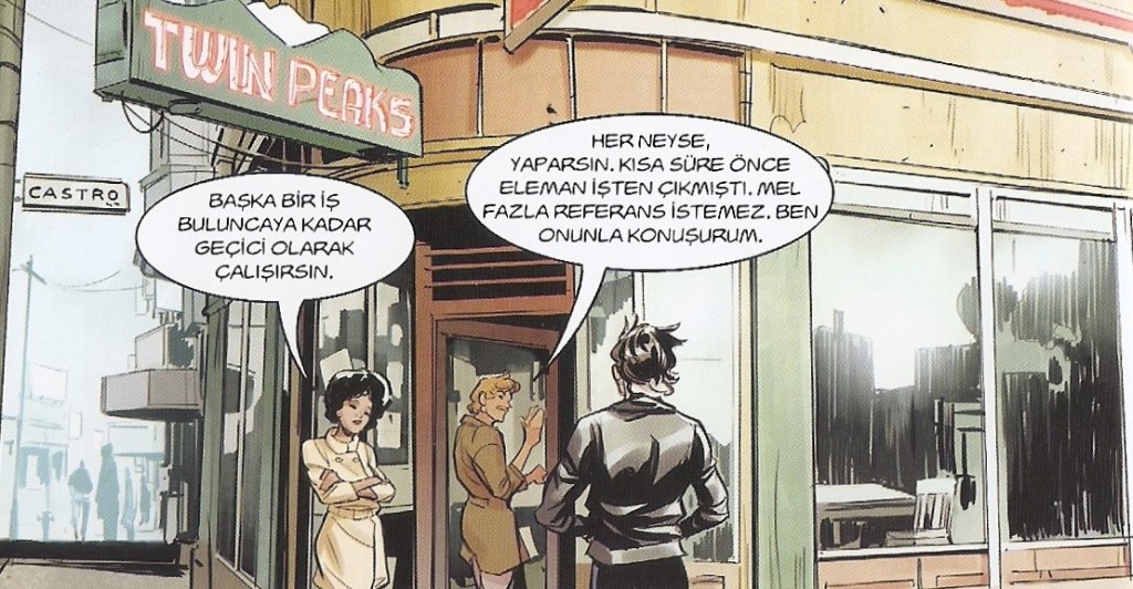Castro caddesinde ki Twin Peaks de bulaşıkçı olarak işe başlar Jerry. Twin Peaks Tavern, tam da o sıralarda San Fransisko’daki en önemli Gay-Lezbiyen mekanı olmaktadır. Burada asıl enteresan olan şudur, Sergio Bonelli (Nolitta), öykülerinde gay ya da lezbiyen kullanmadı (birkaç efemine tipleme dışında). Ama Masiero ve genç patron Davide Bonelli zamanın ruhuna uymuşlar. Mister No’yu gay dostlar ve gay mekanda çalışırken görebiliyoruz. Bu bile devrim sayılmaz mı?