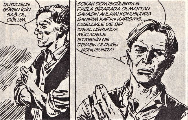 Jerome Drake. Baba drake. Yıllarca Mister No ile babasının, bir türlü anlayamadığımız çelişkisi bizi dertten derde soktu. Nolitta sır gibi sakladı babayı bizden. Ufak tefek kıtırlarla yıllarımızı geçirdi. Fakat, bu sırrı ve barışmalarını Yirmi Yıl Sonra (Lal Yeni 86/88. sayı. Orijinal 292/294) öyküsü ile öğreniriz. Yirmi Yıl Sonra öyküsünü de, Dönüyor öyküsündeki baba Jerome Drake sekanslarını da Roberto Diso çizdi. Bu arada, Mister No’nun kimliğini oluşturan en önemli karakterin, babası olduğunu da görüyoruz. Baba figürünün, yani Jerome Drake‘in, Mister No’nun gezginci, hayır’cı, dalgacı kişiliğinin oluşumunda negatif ya da pozitif nasıl bir etkisi olduğu da ortada.
