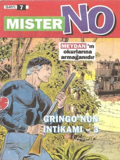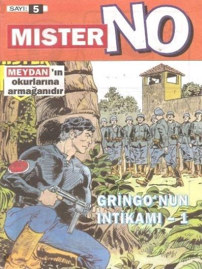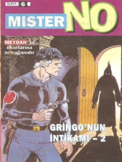 Maceranın son kitabı olan Gringo’nun İntikamı kitabının kapağına geldi sıra. Kapak çok maceralı değil ama, hoş bir muhabbet de çıkıyor. Kapak, tabii ki Ferri ustanın. Kapaktaki sahne bu okuduğumuz maceranın içinden gibi. Gibi diyorum çünkü; olay aslında gece gerçekleşiyor. Birde, dışarı da değil evin içinde gerçekleşiyor. Ve hatta sahne hiç de böyle gerçekleşmiyor! Ayrıca, orijinaldeki Mister No‘nun silahından çıkan duman, sonraki baskılarda yok edilmiş. Ateşlenmiş silahtan hemen duman çıkmayacağına uyanılmış demek ki. Orijinale bakarsanız, duman ‘Daksil’ ile silinmiş (uçuk mavi). Düzeltilmiş Türk baskısında ise bulunmuyor.