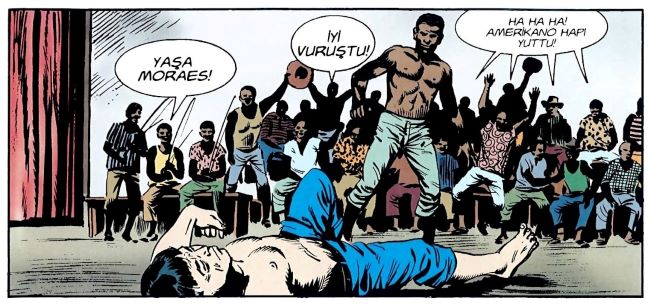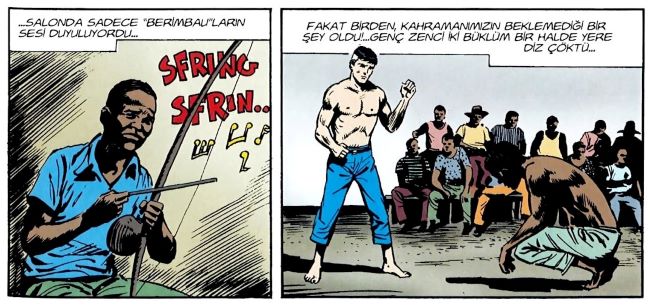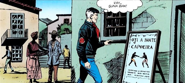 Yazının başında; macera, Mister No’nun bir Kapueyra maçına gitmesiyle başlar, demiştik. Ama, Mister No, seyirci olarak değil de, döğüşmek için gider maça. Amacı 5.000. kuruzeyro kazanmak. Rakibi ise, Kapueyra şampiyonu Antonio Moraes. Nolitta bu ismi kafadan atmamış. Gerçekten de Antonio Carlos Moraes (1923-1997) isimli, Mestre Caiçara (Usta, Master) olarak anılan, Kapueyra dans/dövüş ustası, Kapueyra müzisyeni ve kanaat önderi olan, efsanevi bir insan var. 1969 yılında berimbau ve samba de roda tınıları içeren Kapueyra türünde bir LP kaydetti. Söz konusu albüm, Kapueyra’nın mirası haline gelmiş olup, adını akademisinin adından almıştır: Academia de Angola São Jorge dos Irmãos Unidos do Mestre Caiçara.