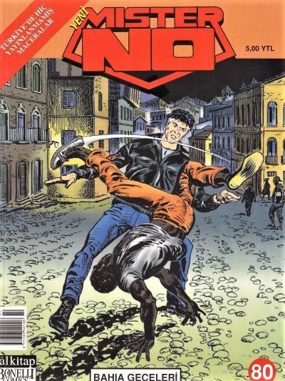 Sonraki üç maceraya şöyle kısaca bir bakalım. Bahia/Kahin (116/119. sayılar. İtalya 1985-Maceraperest KM 29/30. cilt 2012). Miranda‘yı 10 yıl aradan sonra tekrar sahnelerde görüyoruz ve Mister No’nun başını belaya sokuyor. Guido Nolitta, üç yıllık bir aradan sonra serinin yönetimine geri dönüyor. Senaryo, gerçek tarihi olaylardan esinlenerek, 1800’lerdeki Brezilya Hristiyan mesihçiliğine, Mister No monte edilerek yazılmış. Ve Bignotti‘nin temiz çizgisi, sahnelerin dramatik yapısına tam oturuyor. Ayrıca, 119. sayının kapağı, bu seride, Franco Bignotti‘nin çizdiği tek Mister No kapağı.