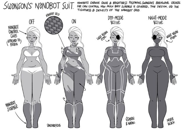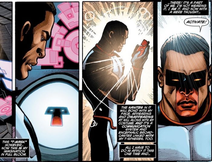 Örneğin, DC Comics‘in en son versiyonu olan Mr. Terrific‘in kostümü ve maskesine nanoteknoloji işlenmiştir. (Gazeteci Jordan Iacobucci’ye göre; çoğu zaman nanoteknoloji, bir sahnenin herhangi bir noktasında oyuncunun yüzünü, süper kahraman maskesiyle örtmek veya açmak için bilgisayar destekli grafik efektleri kullanmanın bir bahanesi.)
