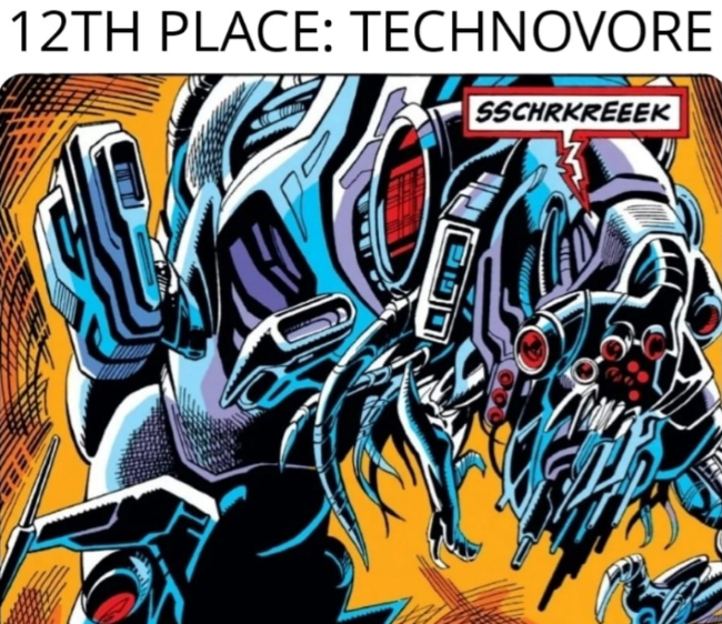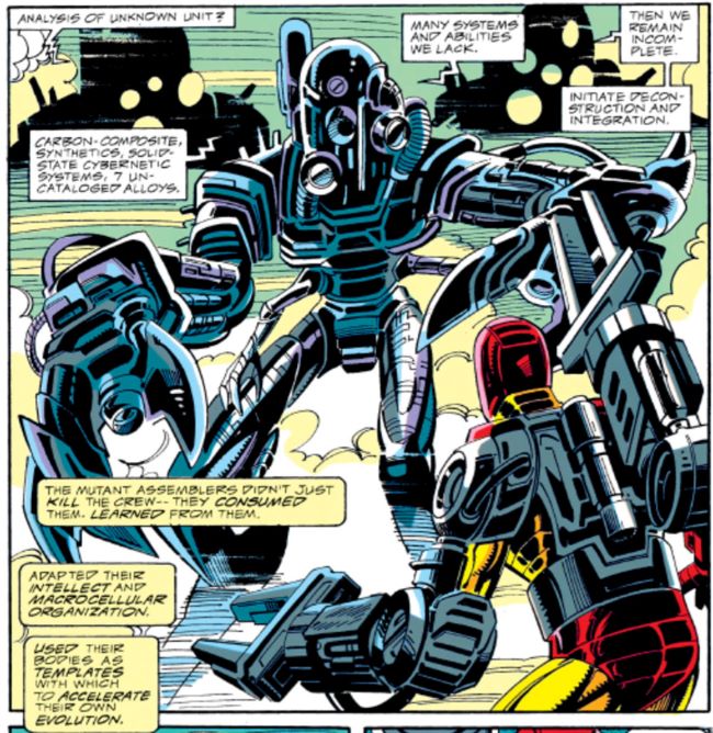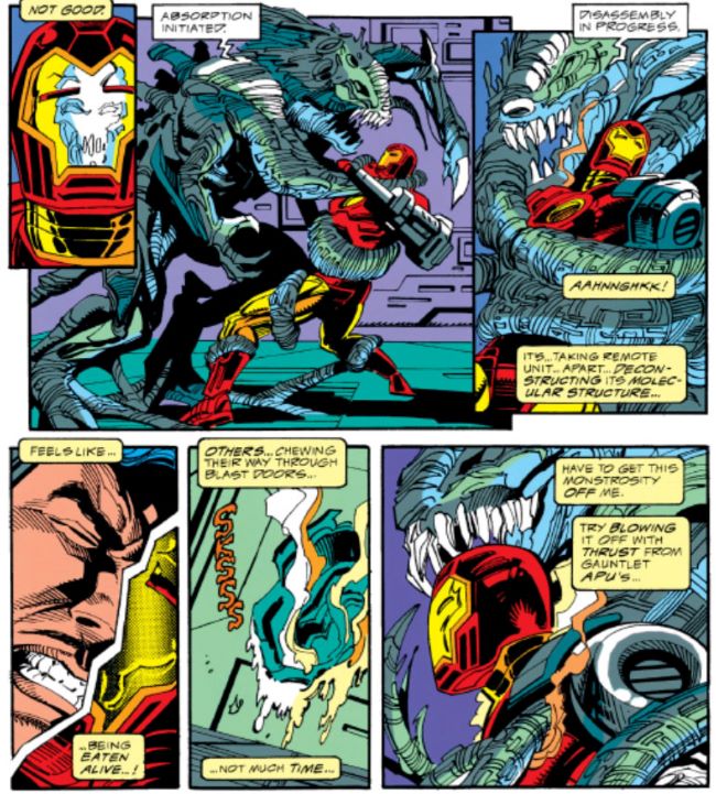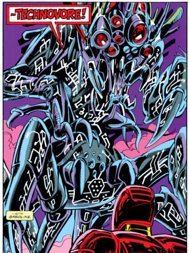 Nanoteknolojinin çizgi romanlardaki en erken görünümlerinden biri, Iron Man 294’te (Temmuz 1993) yer alan Technovore olmuştur. Technovore, Drexler‘in ‘’Yaratılış Motorları‘’ kitabında sunduğu distopik örnek olarak, teknolojiyi kendi içine entegre edebiliyor ve farklı silah türlerine karşı bağışıklık kazanacak şekilde şeklini değiştirebiliyordu. (Bu çalışma, yazının sonunda değineceğimiz, odak noktamız olan çizgi romanlardan ikincisi olacak.)