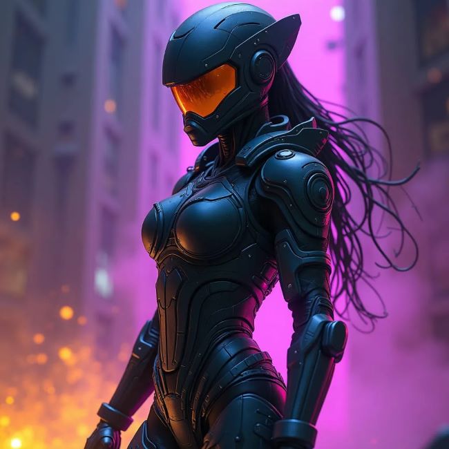 Ayrıca, fütüristik bir şehir manzarasının anıtlarının ortasında duran, iki devasa silah ve diğer saldırı cihazlarını taşıyan mekanik zırhlı bir kadın savaşçının çarpıcı görüntüsünü de içeriyordu.