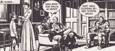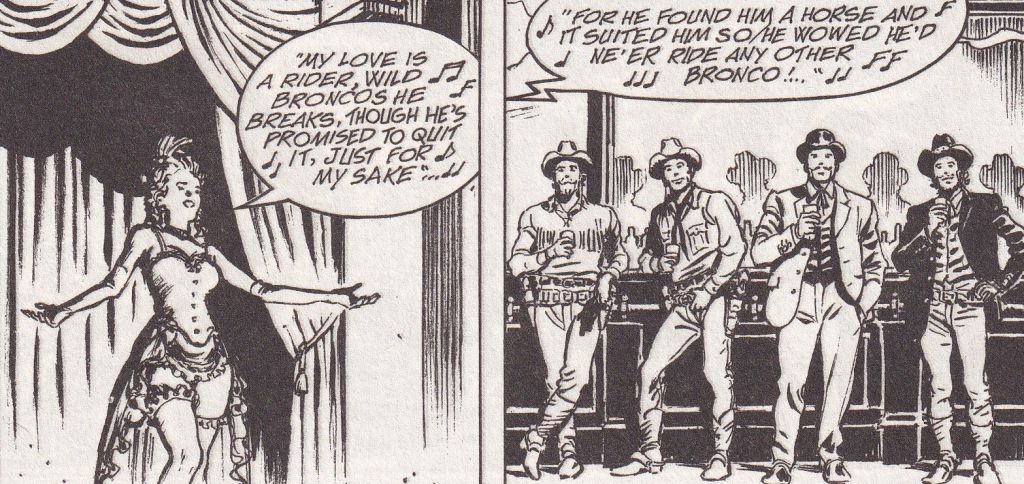 Meraklısına: Kitabın 21. sayfasında şarkı söyleyen Lulah Cristall‘i görürüz. Şarkının ismi ‘Bucking Bronco’ (Kişneyen vahşi at) şarkısının söz yazarı olan Belle Starr (Myra Maybelle Shirley Reed Starr) gerçek bir kanun kaçağıdır (1848-89). Pusuya düşürülüp öldürüldüğünde 41 yaşında idi. Yani anlayacağınız oradaki şarkı uydurma değildir. Şarkı gerçektir, söz yazarı belalı bir kadındır. Ruju bize bu işlerden anlarım diyor. Günümüze