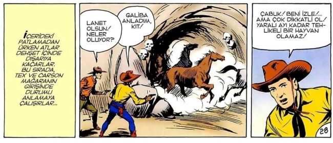 Son olarak; 1952 yılında, 1. Onur serisinde yayınlan Devil’s Hole Görevi‘nin 28. sayı kapağı da çok güzel bir kapak. Ve Galep, öykü içinden bir vinyeti, Tex’i de ekleyerek yeniden çizmiş.