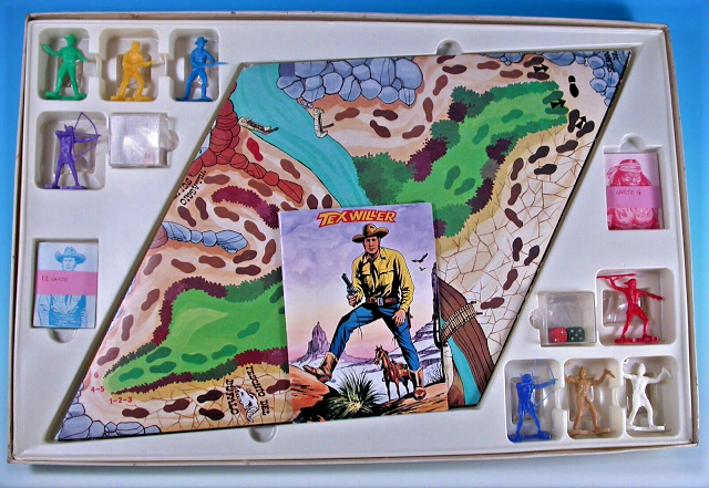 Yetmez. Sunset Çiftliği kapağındaki bu poz, 1975 yılında alakasız bir şey için de kullanılmış. Ama çok güzel bir grafik olmuş. Galleppini‘nin kendisi tarafından yapılan bu resim bir masa oyununa uyarlanmış. Usta bütün arka fonu, dağları değiştirmiş ve kızılderililer eklemiş. Ama en önemlisi; ilk defa sol ayağı göstermiş bize. Birde; Tex‘in elindeki görünmeyen tabancayı açığa çıkarmış.