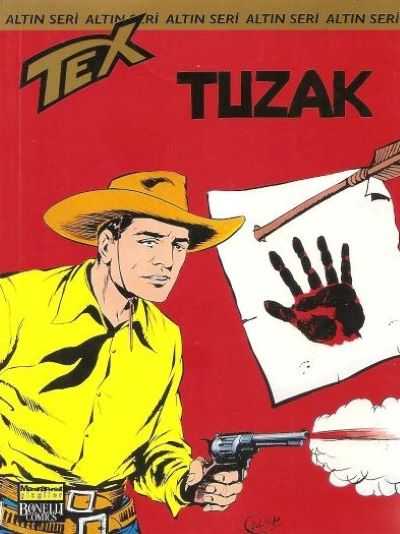 Tuzak kitabının kapak öncülü olan kapak; 2. Onur serisinin 19. sayı kapağındaki Tex figürünün yanına Kırmızı El çetesinin amblemi iliştirilerek hazırlanmış. Onur serisinin 19. sayı kapağındaki resim ise Gizemli Dağ kitabının 141. sayfasından alınmış. Tabancadan çıkan dumanın da Bignotti tarafından tasarlandığı söyleniyor. Kızılderili işaretleri kitabının kapağı ise; 4. Onur serisinin 13. sayı kapağındaki Tex, arkadaki kartal ve dumanlardan ayıklanarak, yine Bignotti’nin tasarımı olan bir madalyonun üstüne işlenmiş.